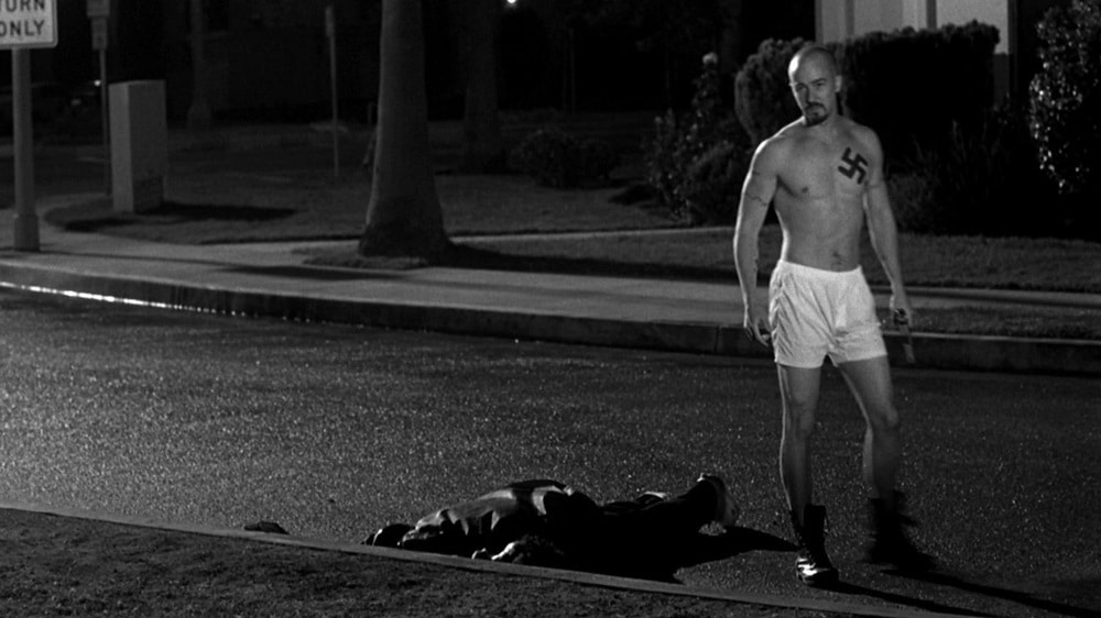 Trompeten werden durch laue Stöße angekurbelt, die repetitiven Trommelschläge wirken wie Gewehrschüsse, bis die sakrale Chormusik ertönt und die in traurigem Schwarz-Weiß gehaltene Aufnahme der Strandpromenade von Venice Beach in ihrer bleiernen Schwere abrundet. Später hören wir das lustvolle Stöhnen einer junge Frau, sehen sie beim Geschlechtsverkehr, bis kurz darauf wirklich Schüsse aufschreien und die Leichen dreier Afroamerikaner die Auffahrt der Familie Vinyard zieren: Ein Verbrechen aus ideologischer Überzeugung, keine Notwehr, kein Akt der Verzweiflung. Die ersten Minuten von American History X fordern den Zuschauer bereits einiges ab und führen ihm seine Stärken konkret vor Augen. Die Bildsprache nämlich ist derart suggestiv, dass sie es schafft, den Zuschauer einem Sog gleich ganz nah vor die Mattscheibe zu locken. Filmisch ist American History X zweifelsohne etwas ganz Besonderes, die visuelle Ebene wird vitalisiert von ausdrucksstarken Impressionen, die sich geradewegs ins Gedächtnis brennen.